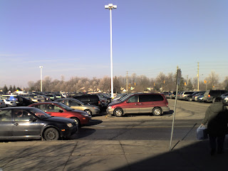 El estacionamento estaba absolutamente lleno, pero eso no es problema cuando yo manejo, porque siempre me las arreglo para conseguir el mejor lugar posible (como contaba en un post anterior). Y ayer no fue la excepción, como pueden ver. Gaby odia que yo tenga tanta suerte; si ella hubiese estado manejando, habríamos terminado estacionando más cerca de casa que del mall...